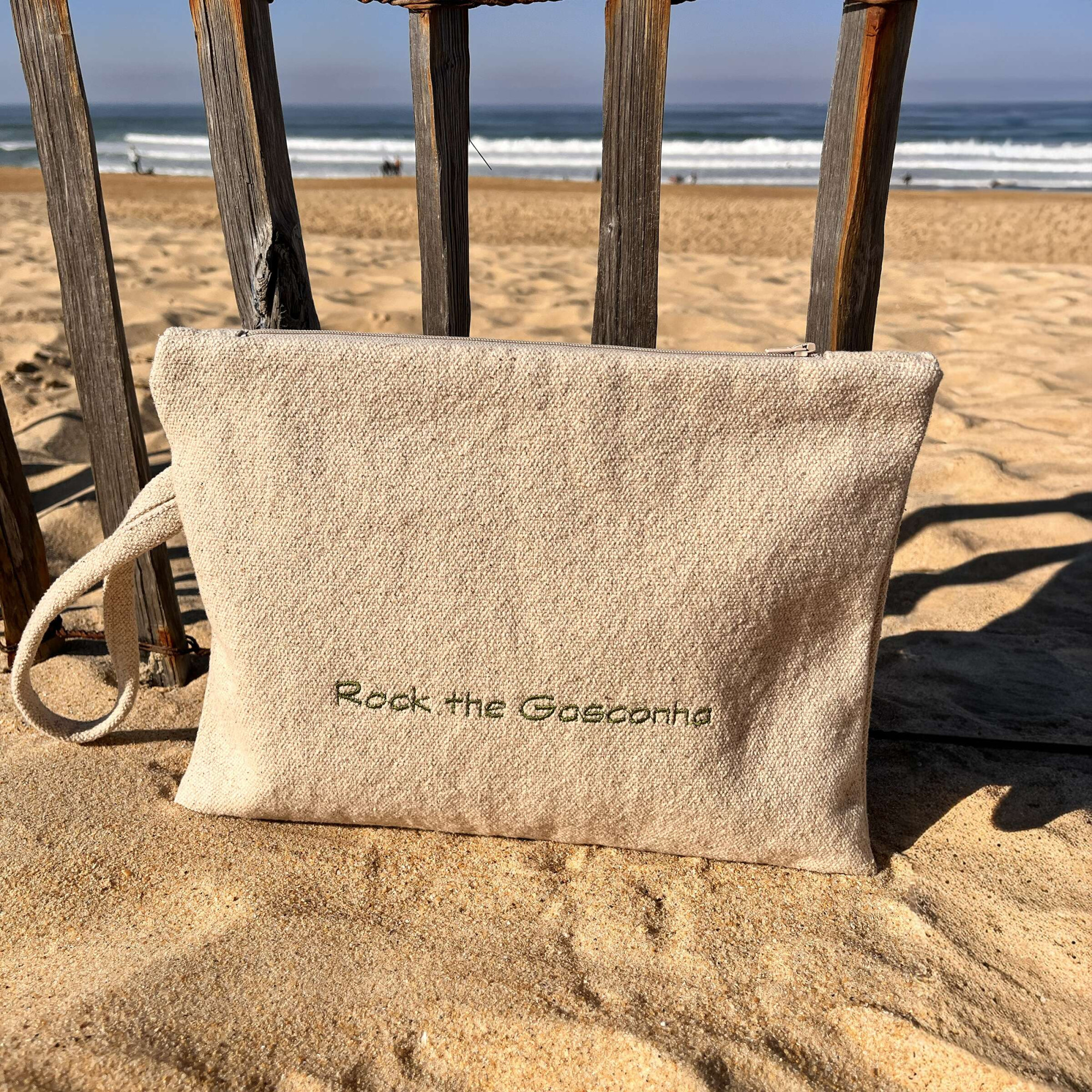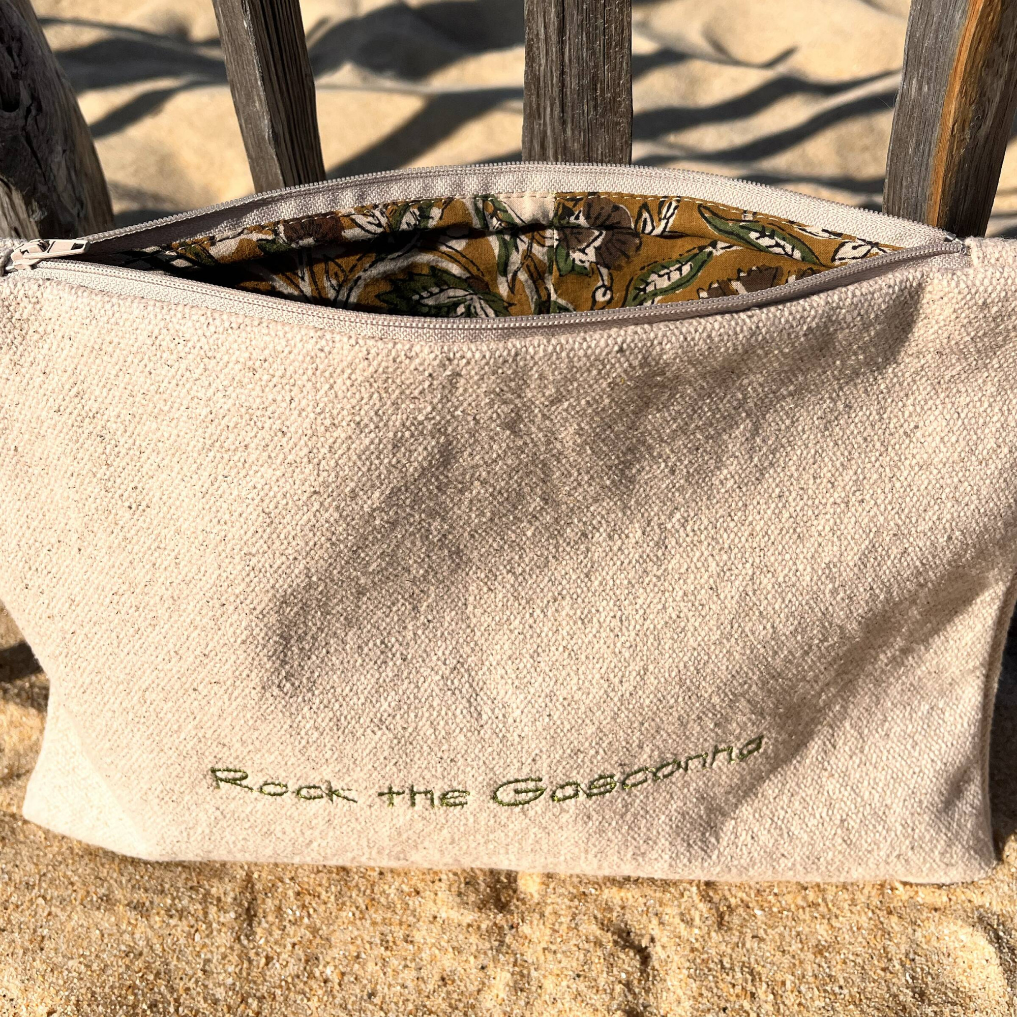 Pochette Coton, intérieur doublé Coton et fermeture éclair, Coloris beige et broderie verte, dimensions 25x34 cms. Chaque pochette est une création unique, réalisée à partir de tissus recyclés soigneusement sélectionnés — une touche d’authenticité et de style durable pour sublimer votre quotidien.